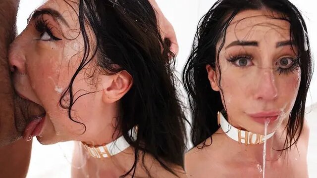 This amateur teen slut takes on a huge shaft, gagging and deepthroating him. She gives a sloppy blowjob, taking him balls deep and swallowing every inch. He finishes by cumming all over her face.